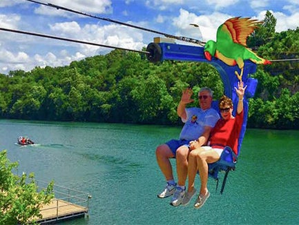 Take flight with Parakeet Pete's Waterfront Zipline in Branson, MO, and zoom across Lake Taneycomo at thrilling speeds! Enjoy stunning views of Downtown Branson and the lake from a comfortable seat—no harness required! Featuring a unique seat system, this zipline at Branson Landing offers an unforgettable adventure for friends and family.