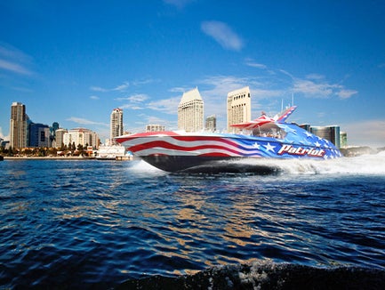Offered by Flagship Cruises & Events, the Patriot Jet Boat Ride lets guests enjoy a thrilling jet boat ride with 360-degree turns, sharp spins and ultra-fast speeds. Each 30-minute ride offers complete entertainment as waves crash, music plays and winds roar over San Diego Bay. Passengers will love experiencing the speed of two turbo-charged engines with more than 1,400 horsepower each.